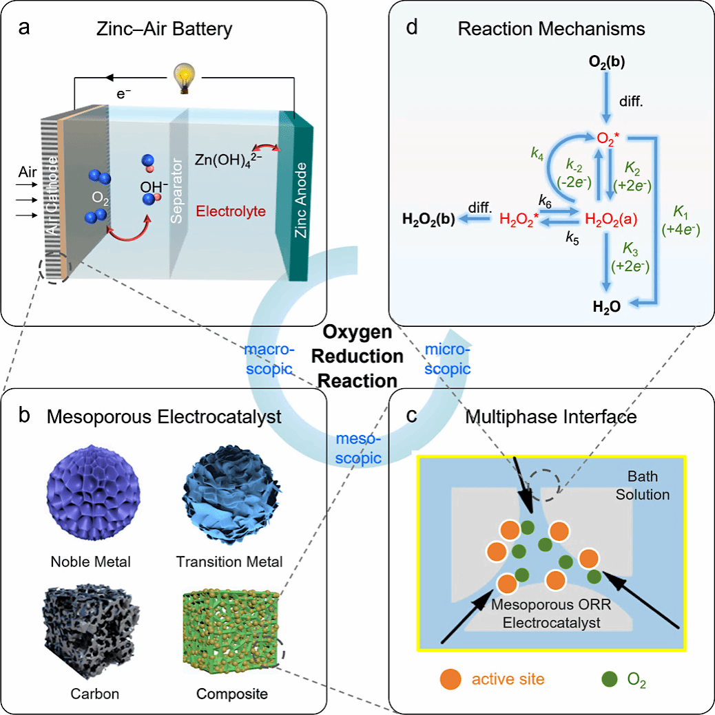作为金属空气电池等可持续能源技术核心过程的ORR,在能量转换效率中起着决定性作用,但通常受到缓慢的本征动力学的影响。传统的铂基催化剂虽性能优异但成本高昂,而具有高比表面积、丰富活性位点和快速传质能力的介孔电催化剂(孔径2–50 nm)为解决这一难题提供了新思路。作者系统梳理了四大类介孔ORR电催化剂:贵金属基材料通过介孔结构设计大幅减少铂用量,过渡金属基材料(如钴/锰氧化物及其合金)展现出低成本替代潜力,碳基材料实现了活性与化学稳定性的平衡,而多组分复合材料能够实现多个单元优势的结合。为深入理解反应机制,作者重点介绍了原位光谱技术在揭示ORR中间体方面的关键作用。