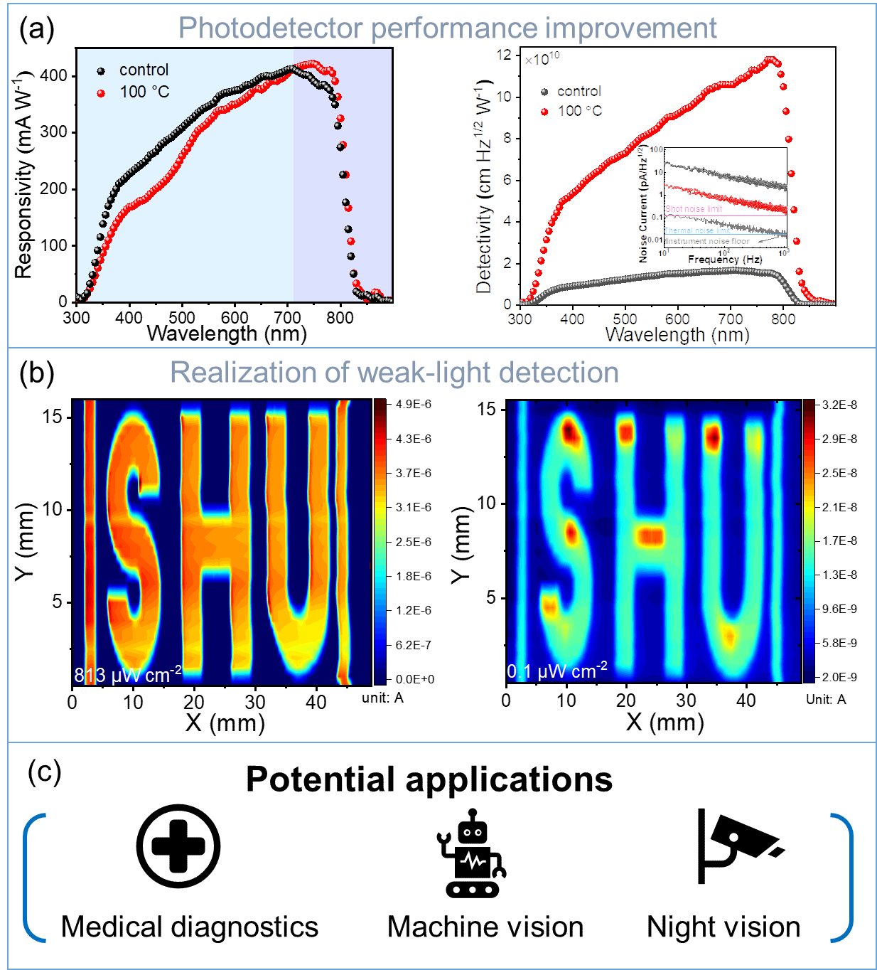近日,材料基因组工程研究院王生浩教授团队在二维钙钛矿光电探测器领域取得重要进展。团队通过热调控方法制备出高结晶性、高稳定性的二维钙钛矿薄膜,显著增强了其在近红外(NIR)弱光条件下的光电探测性能。相关成果以题为“A 2D Perovskite Photodetector for NIR Range and Weak‐Light Imaging Applications via Thermal Regulation”的研究论文形式,发表在材料科学领域著名期刊《Advanced Functional Materials》(影响因子:18.5)。